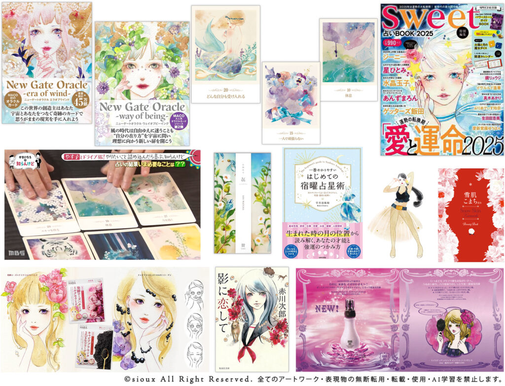 代表的な仕事はオラクルカード(7刷増刷・2026年3月現在)、書籍・雑誌装画、化粧品・サプリメントパッケージなど。